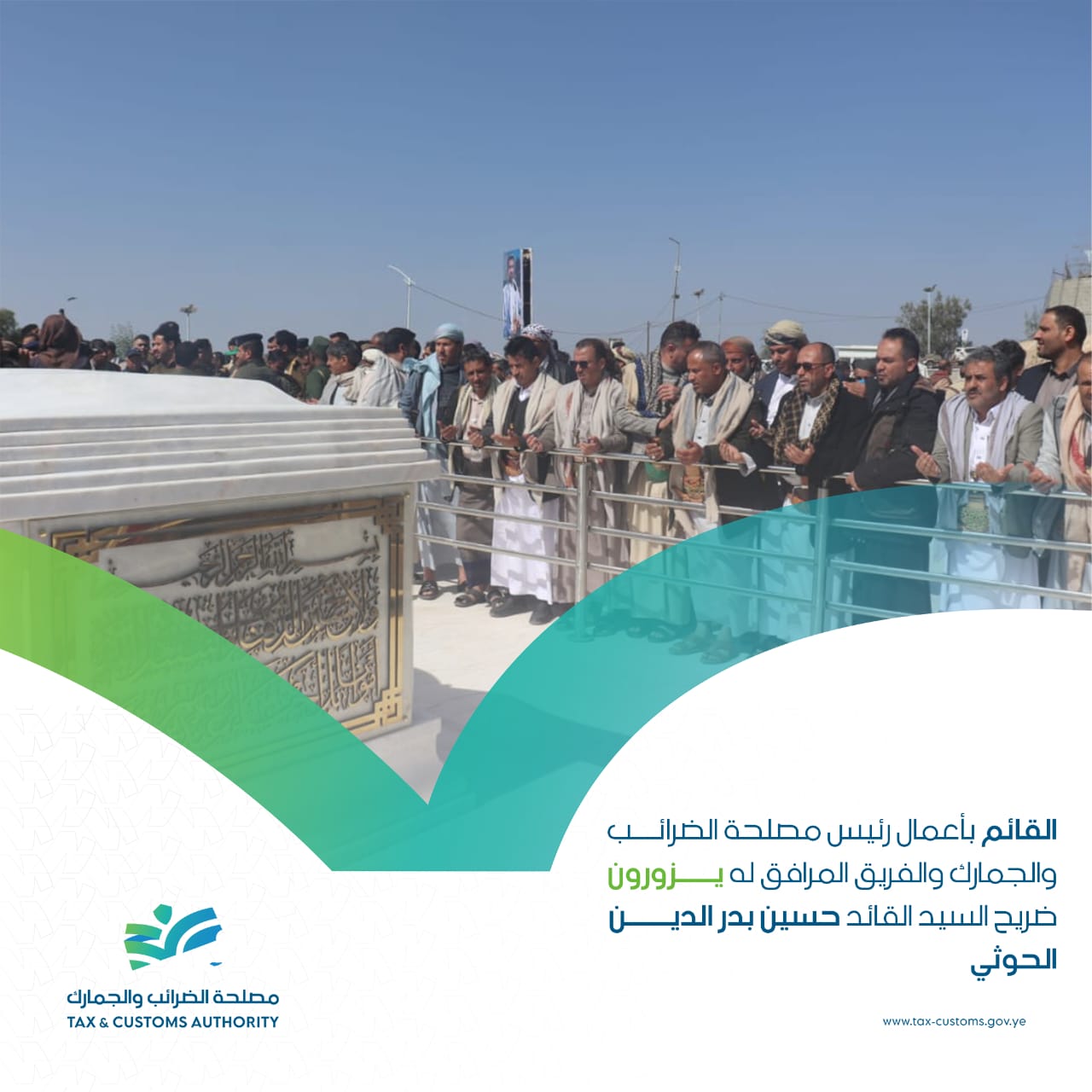 زار القائم باعمال رئيس مصلحة الضرائب والجمارك الدكتور ابراهيم علي مهدي يوم امس الخميس، برفقة المهندس عادل احمد مرغم والاستاذ يوسف علي زبارة، الرئيسان السابقان لمصلحة الجمارك، وفريق من وكلاء ومدراء عموم وموظفي المصلحة، ضريح شهيد القرآن السيد حسين بدر الدين الحـ-ـوثي في محافظة صعدة، وذلك تزامنا مع الذكرى السنوية لشهيد القرآن، حيث استمعوا خلال الزيارة الى نبذة من سيرته الزكية وقرأوا الفاتحة على روحه الطاهرة.